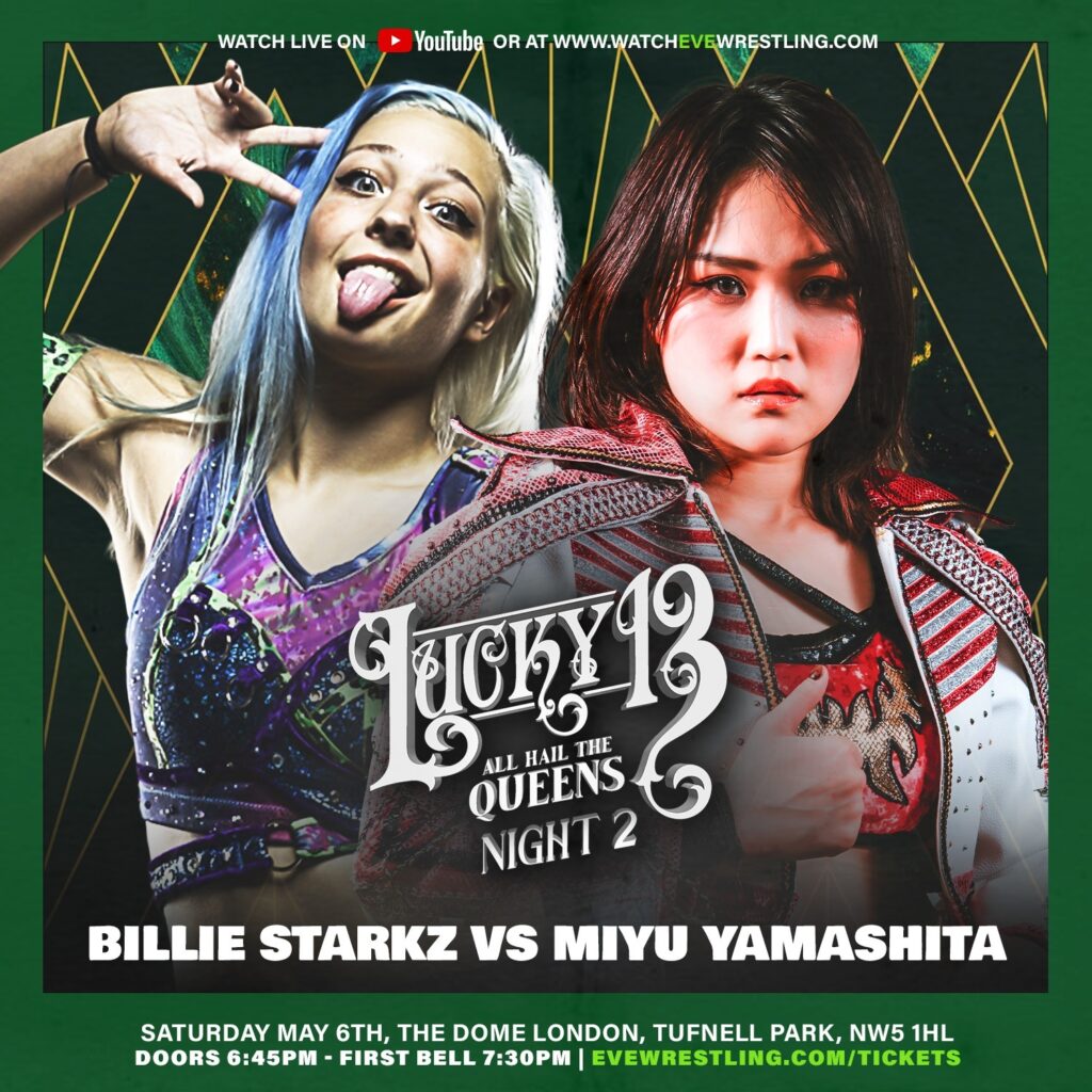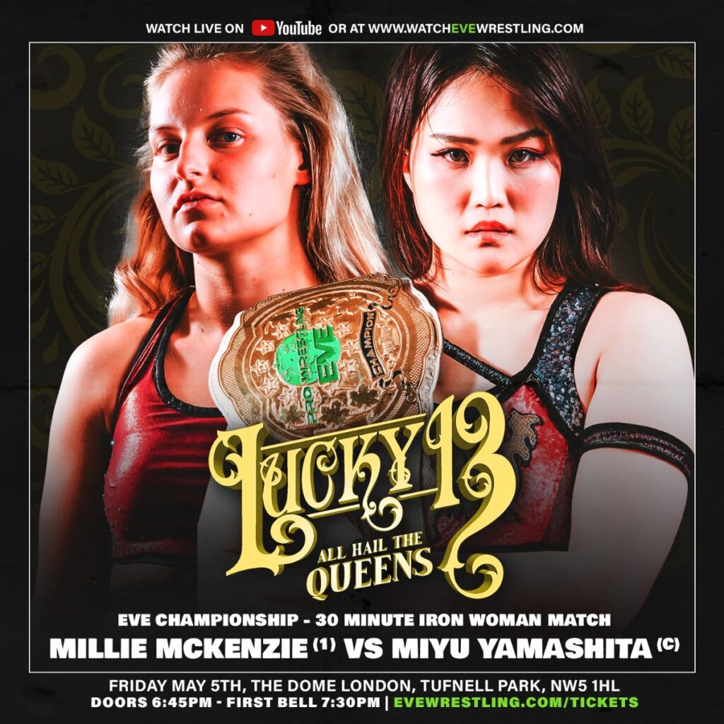 Pro Wrestling EVE returns this week with two shows to celebrate their 13th anniversary. Definitely the biggest celebration taking place in London this weekend in my view. The top of the card is undoubtedly the main event of Friday’s show: a 30-minute iron woman match for the EVE Championship between champion Miyu Yamashita and Millie McKenzie. The shows also boast the UK debuts of Billie Starkz and Janai Kai, and will be available to watch on YouTube, the first half of each show for free and the second half under the Champion Tier of the EVE subscription. Here is a rundown of the matches announced thus far.